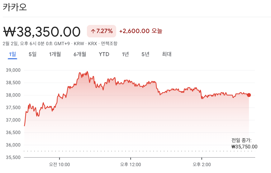 2025년 3월 5일 기준으로 카카오의 주가는 ₩38,350.00로, 하루 동안 7.27% 상승하여 ₩2,600.00의 증가를 보였습니다. 주가는 하루 동안 ₩39,000.00에 근접하기도 했으며, 이전 종가는 ₩35,750.00로 기록되었습니다. 이러한 주가 상승은 카카오의 긍정적인 실적 발표와 함께 시장의 기대감이 반영된 결과로 볼 수 있습니다.